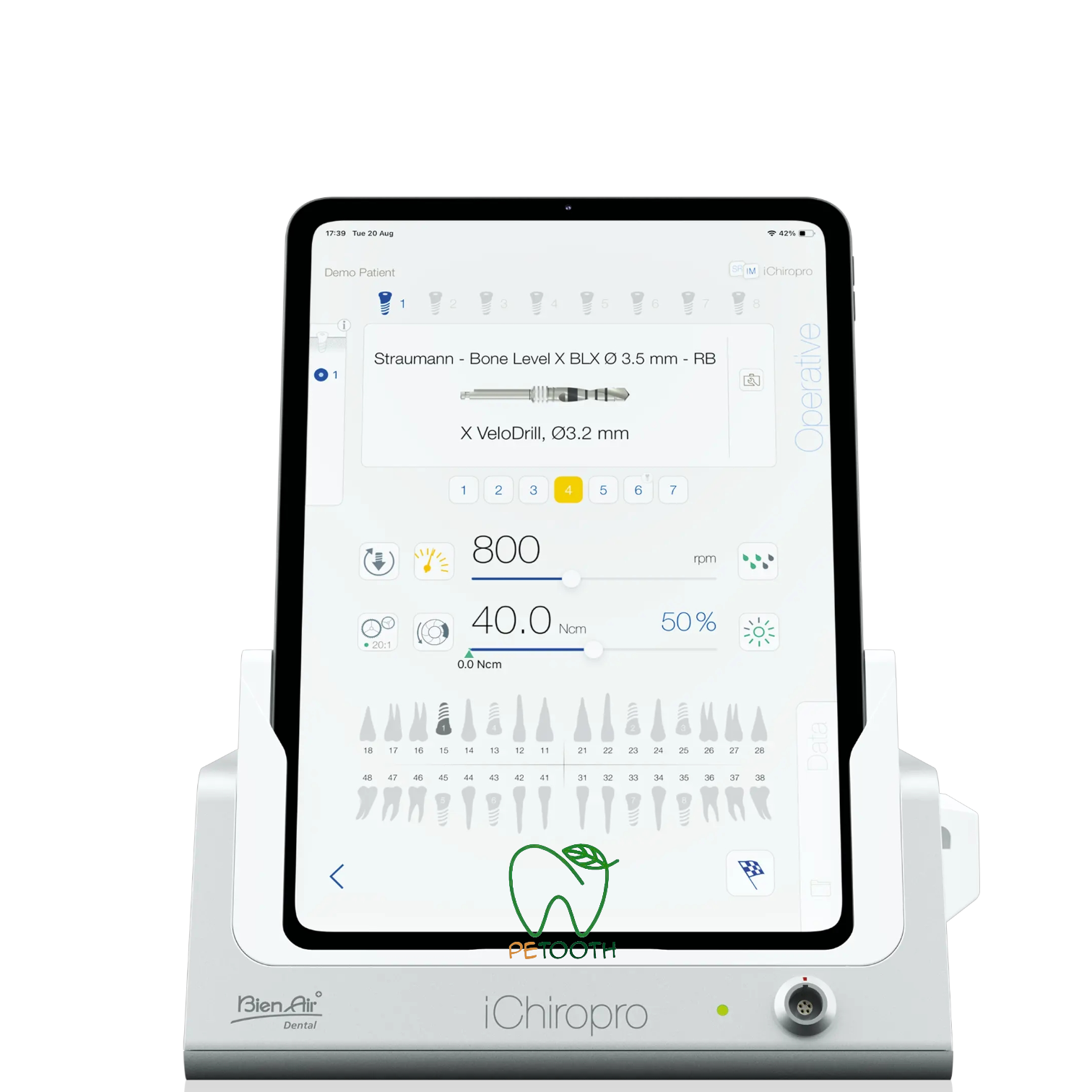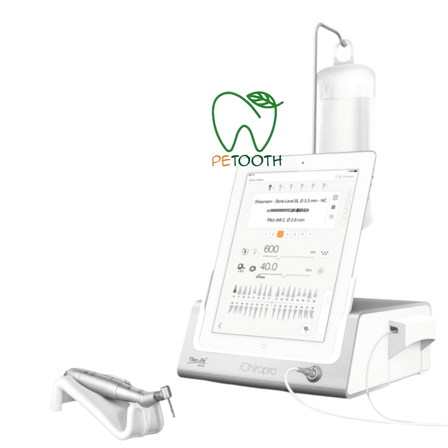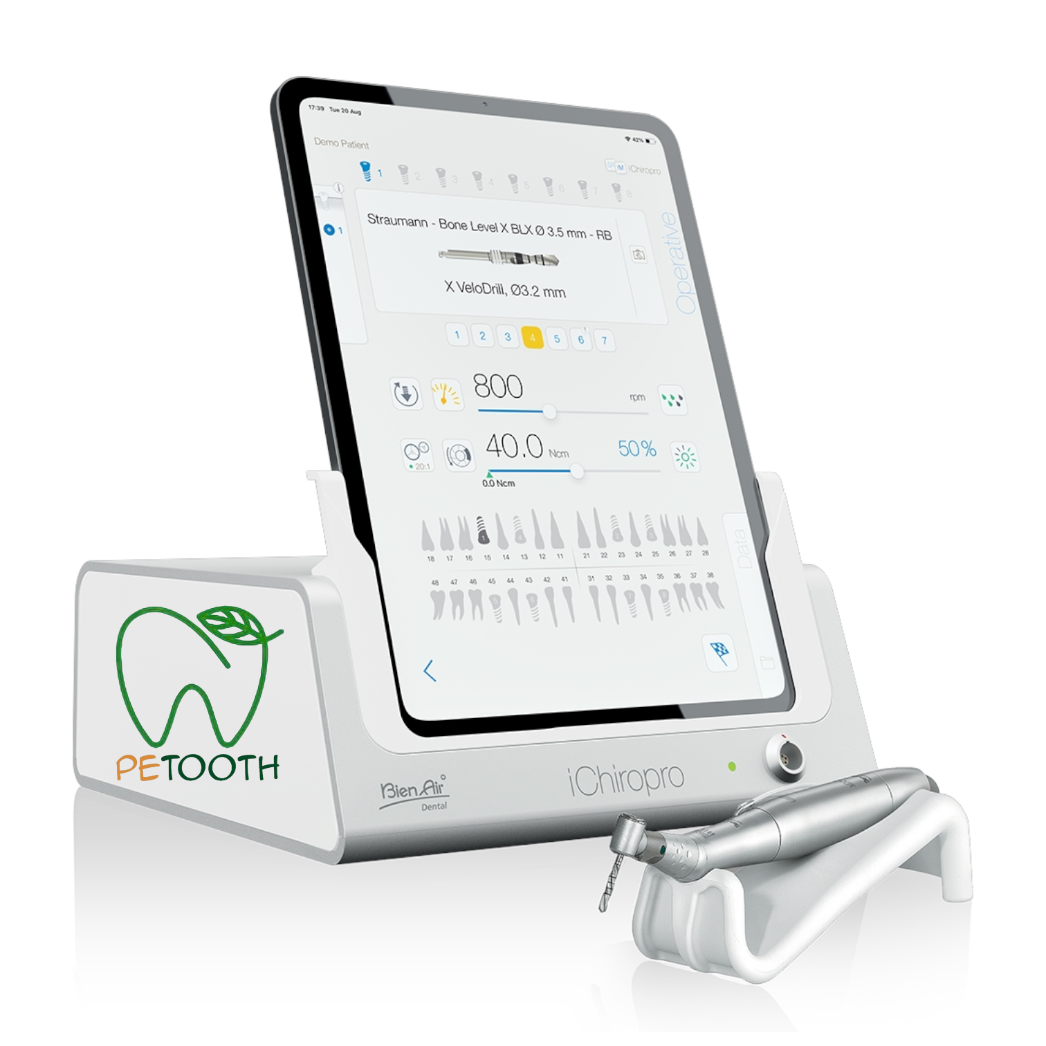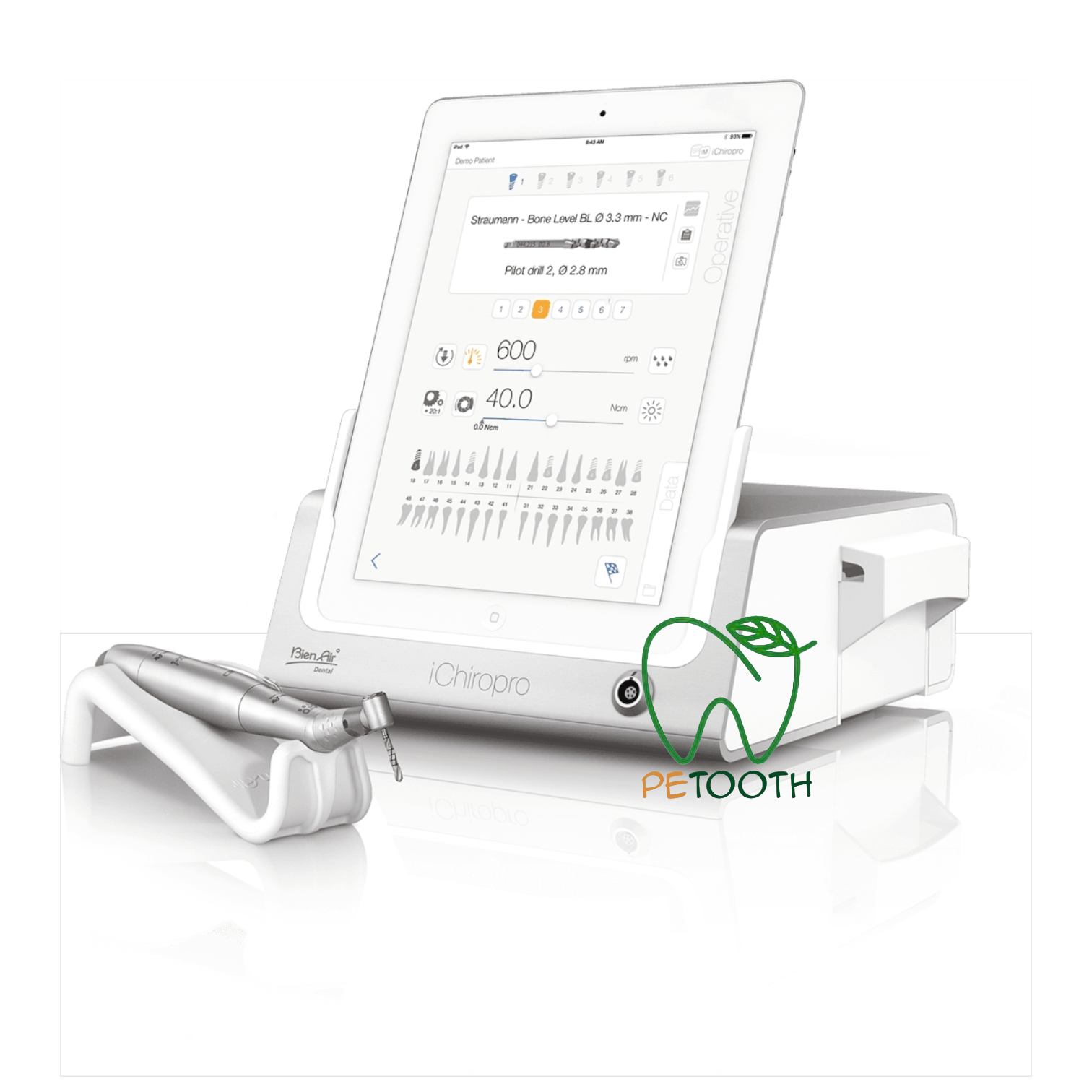 طراحی و تولید موتور ایمپلنت بین ایر Bien Air مدل ichiropro در کشور سوئیس صورت گرفته است. گشتاور این دستگاه بین 8 تا 70 نیوتون بر سانتیمتر است که در ضریب های مختلف تنظیم میشود. همچنین دندانپزشک میتواند سرعت چرخش دستگاه را بین 100 تا 40000 دور در دقیقه تنظیم نماید. میکروموتور به کار رفته در این دستگاه از نوع اپتیک بدون ذغال و بی صدا است. اینسترومنت این موتورایمپلنت از نوع آب از داخل میباشد و حافظهای با ظرفیت نامحدود دارد به طوریکه علاوه بر 300 برنامه پیش فرض ایمپلنت و 4 برنامه جراحی، کاربر نیز میتواند برنامههای دلخواه خود را ایجاد و ذخیره کند.این موتور ایمپلنت مجهز به صفحه نمایش ipod و پدال چند منظوره برای کنترل دستگاه بوده و مورد تایید استاندارد های CE اروپا ، ISO و FDA امریکا می باشد